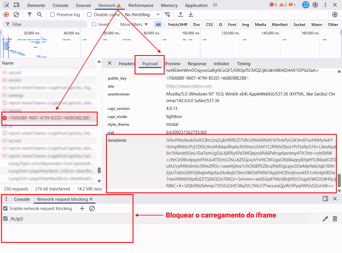 blobválido. Para fazer isso, pressione Ctrl + Shift + P (em navegadores Chromium), digite Enable network request blocking, habilite o bloqueio de requests e adicione um padrão como:/fc/gt2Após recarregar a página, o iframe será bloqueado. Copie o valor do parâmetro