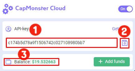 Insira a chave da API no campo correspondente (1), pressione o botão salvar (2). Se você inseriu a chave correta, seu saldo será exibido abaixo (3).