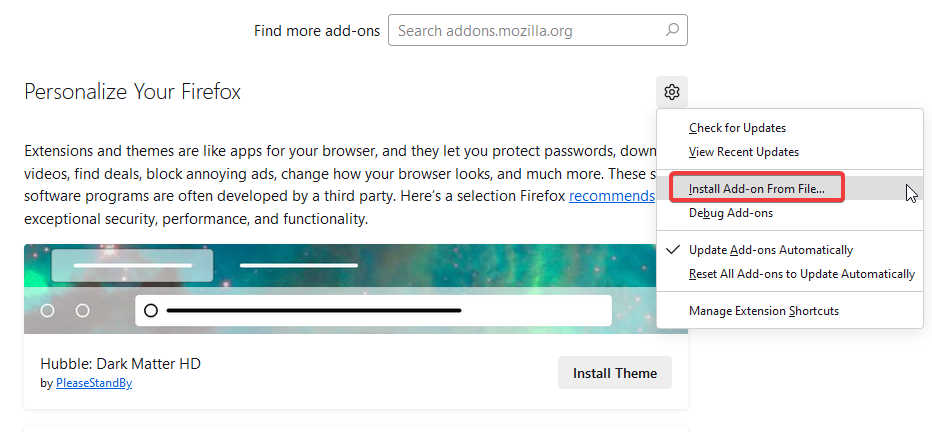 Clique no botão de engrenagem e, na lista suspensa que se abre, selecione Instalar add-on a partir do arquivo...