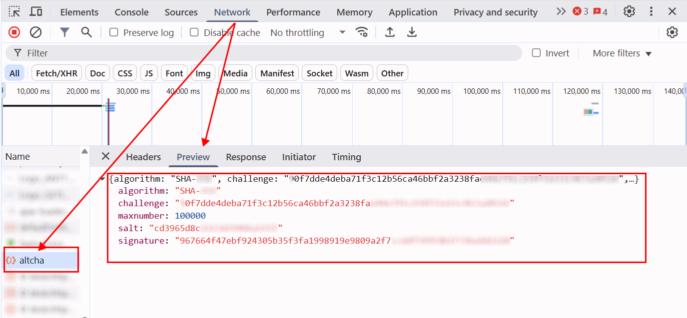 В браузере откройте страницу с Altcha, запустите DevTools (F12 или Ctrl+Shift+I), затем перейдите на вкладку Network.