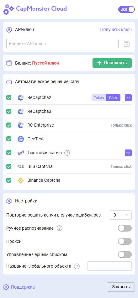 При возникновении ошибок в разгадывании капч см. глоссарий ошибок.