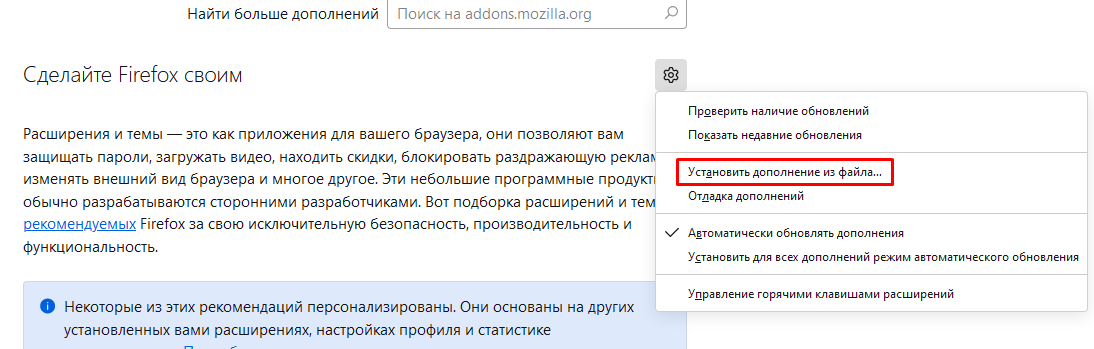 Нажмите кнопку шестеренки, в открывшемся выпадающем списке выберите пункт Установить дополнение из файла…