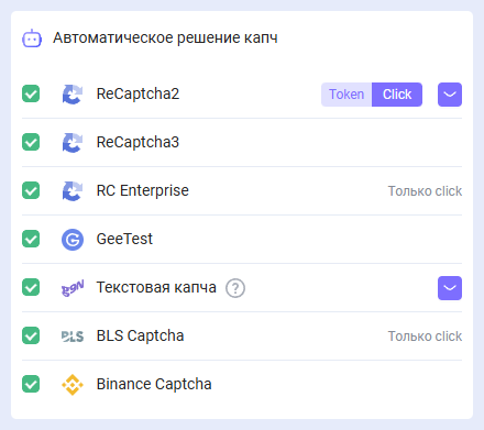 Здесь вы можете выбрать те типы капч, которые расширение будет распознавать автоматически