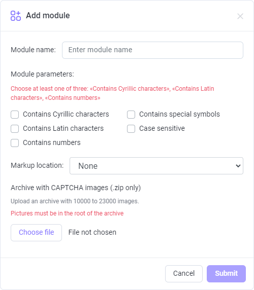 要回答这个问题,请在模块训练页面的表单中标记您的验证码包含的符号类型。完成后,在上传存档按钮上方会显示一个提示,告诉您需要上传多少验证码:支持的图片格式